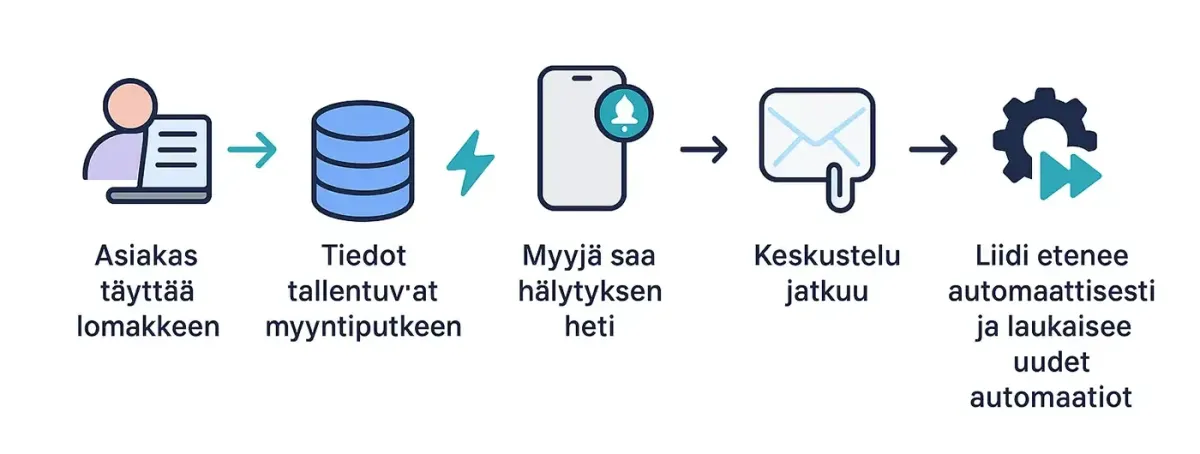 Tiedot menevät suoraan myyntiputkeen, myyjälle lähtee ilmoitus ja asiakkaalle kiitosviesti + liite-esite. Kun asiakas vastaa, työputki siirtää hänet seuraavaan vaiheeseen ja laukaisee uudet automaatiot.